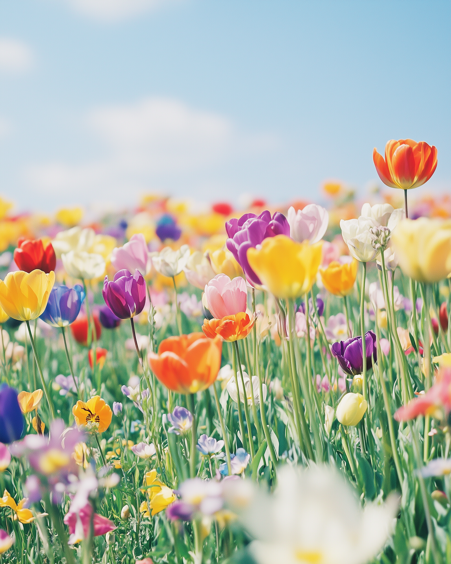 A vibrant field of colorful tulips in full bloom under a clear blue sky, creating a lively and cheerful atmosphere.