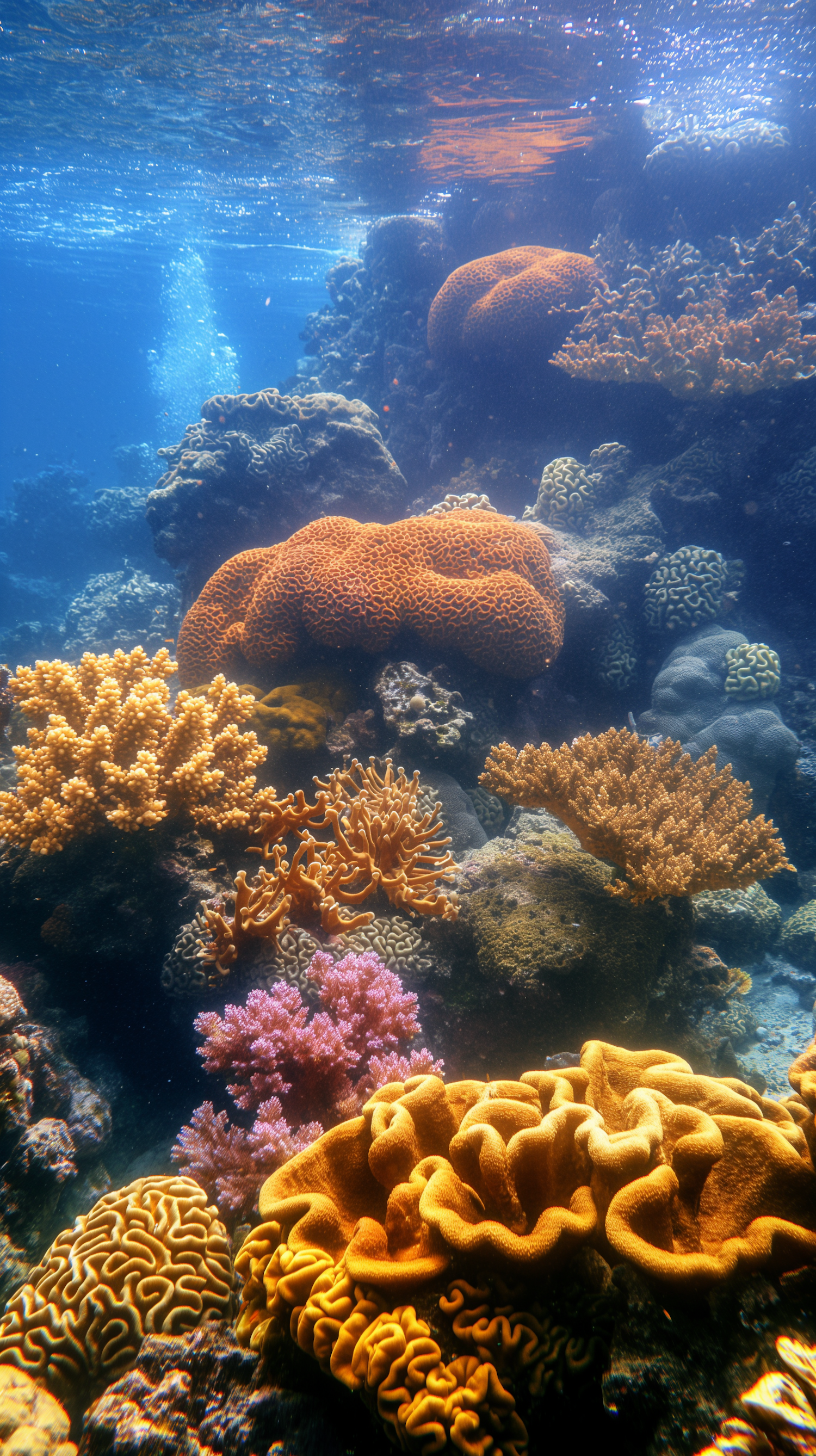Vibrant underwater coral reef with diverse corals in orange, yellow, pink, and purple hues, illuminated by shimmering sunlight.