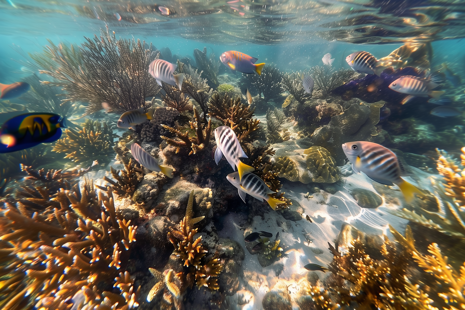 Vibrant underwater scene with striped fish and colorful coral reefs in clear turquoise water, illuminated by sunlight.