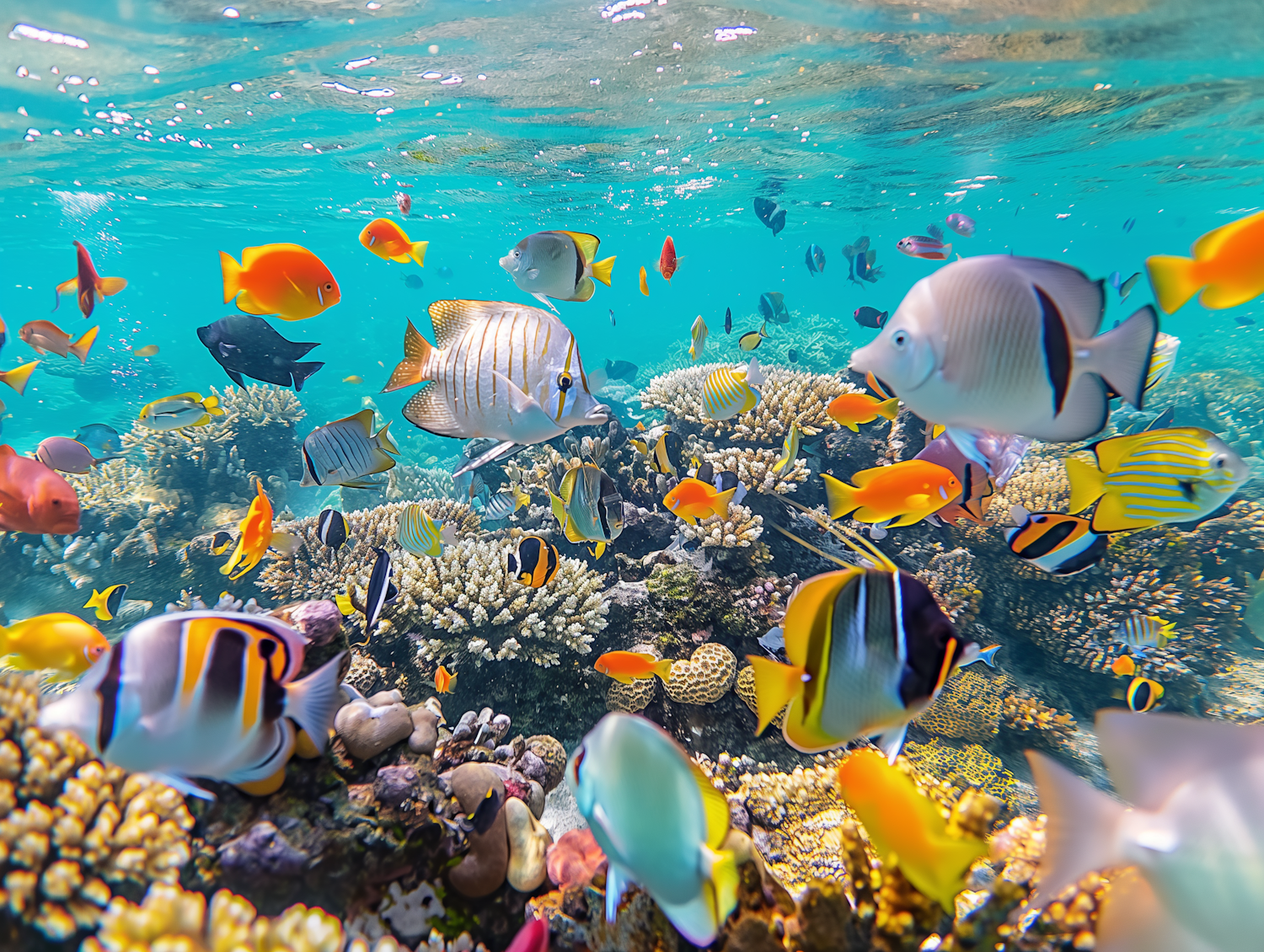 Vibrant underwater scene with colorful tropical fish and coral reefs in clear turquoise water.