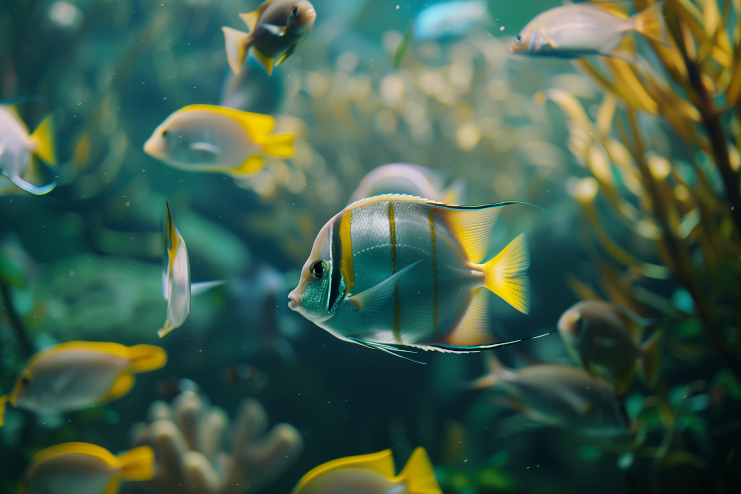 Colorful angelfish and companions swim in a vibrant underwater scene with lush aquatic plants and dynamic movement.