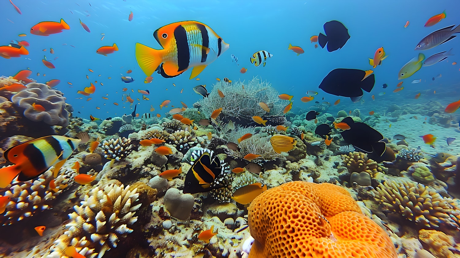 Vibrant underwater scene with colorful fish and corals in a clear blue ocean, showcasing marine biodiversity and beauty.