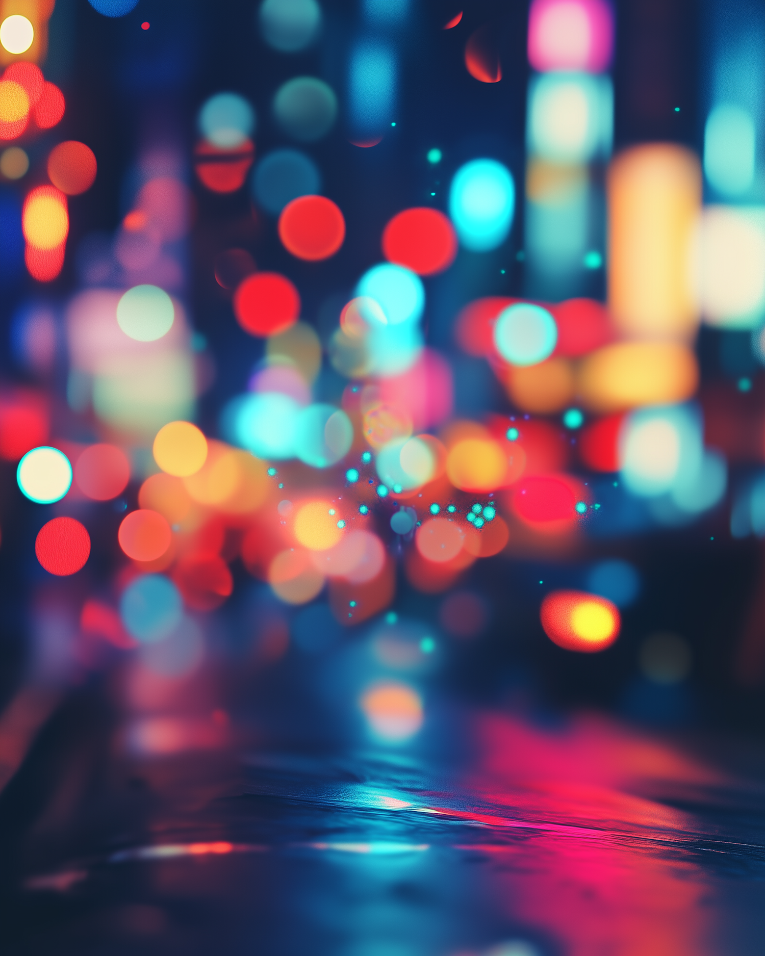 Vibrant abstract bokeh lights in red, blue, and yellow, creating a lively city night atmosphere with reflective surfaces.
