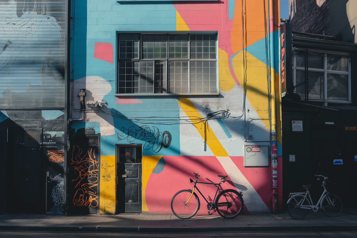 Colorful urban mural with geometric shapes and parked bicycles, creating a vibrant street art scene in bright sunlight.
