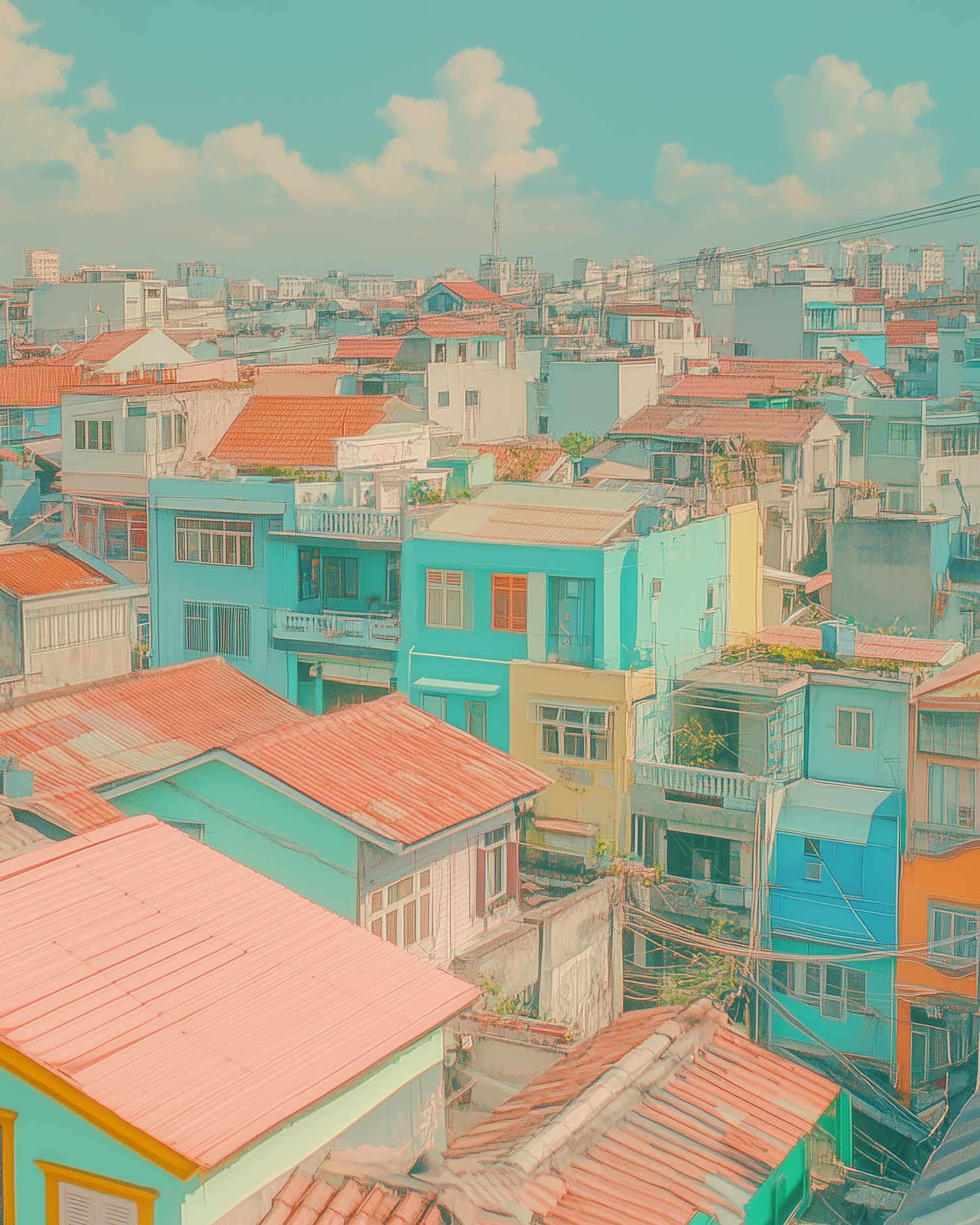 Vibrant cityscape with colorful buildings in turquoise and orange hues under a serene blue sky with fluffy clouds.