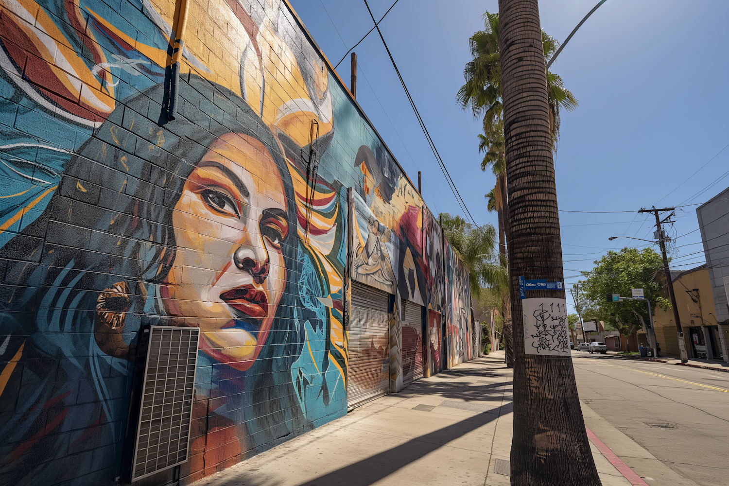 Colorful mural of a woman's face on a city street, surrounded by palm trees and a clear blue sky, creating a vibrant urban scene.