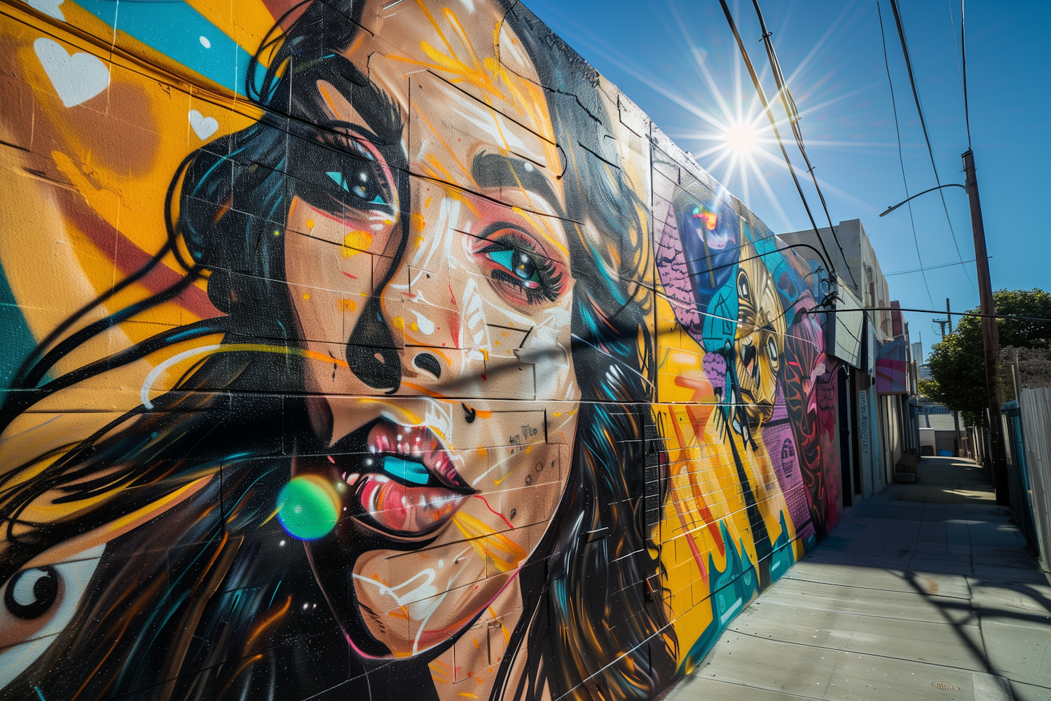 Vibrant street art mural of a woman's face with bold colors and abstract patterns in an urban alleyway under a bright sun.