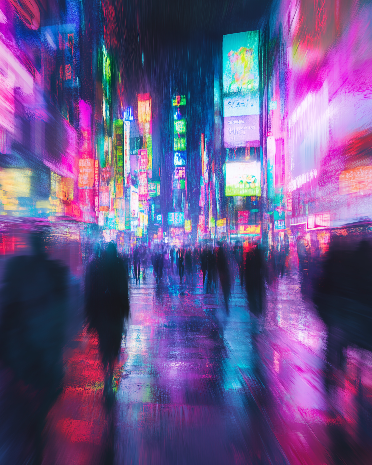 Vibrant cityscape with neon lights reflecting on wet streets, blurred silhouettes of people, and towering illuminated signs.