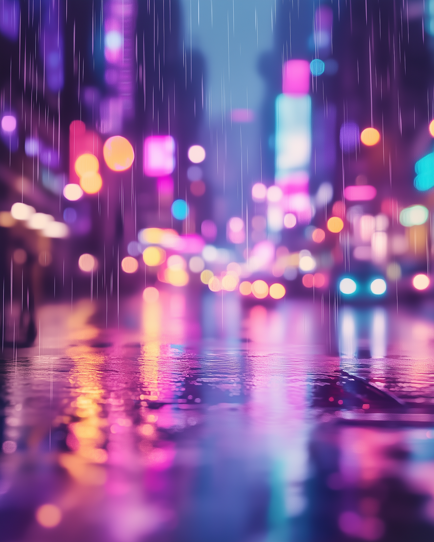 Rainy city street at night with vibrant neon lights reflecting on wet pavement, creating a dreamy, futuristic atmosphere.