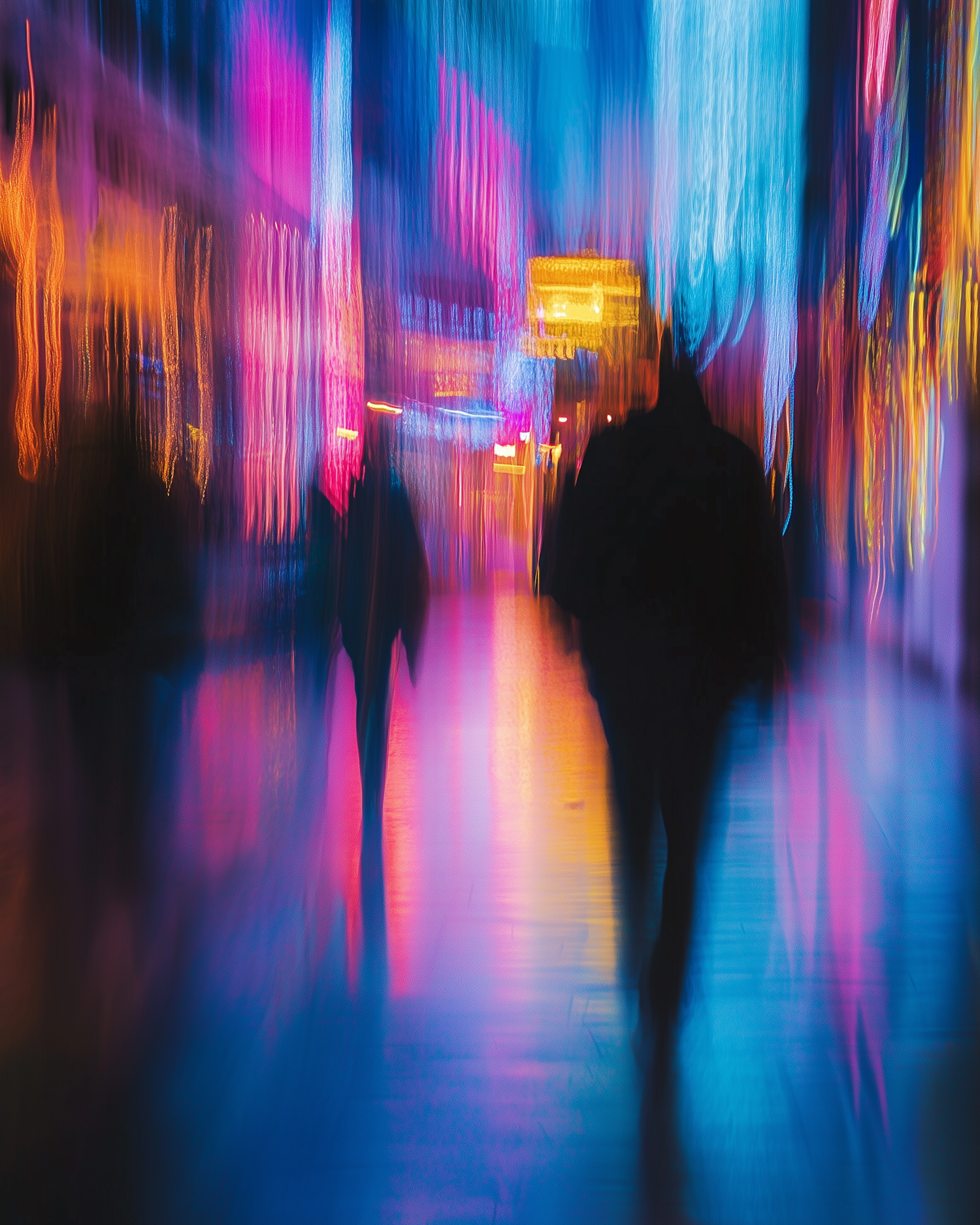 Abstract cityscape with blurred silhouettes and vibrant neon lights in blue, pink, and orange, creating a dynamic urban atmosphere.