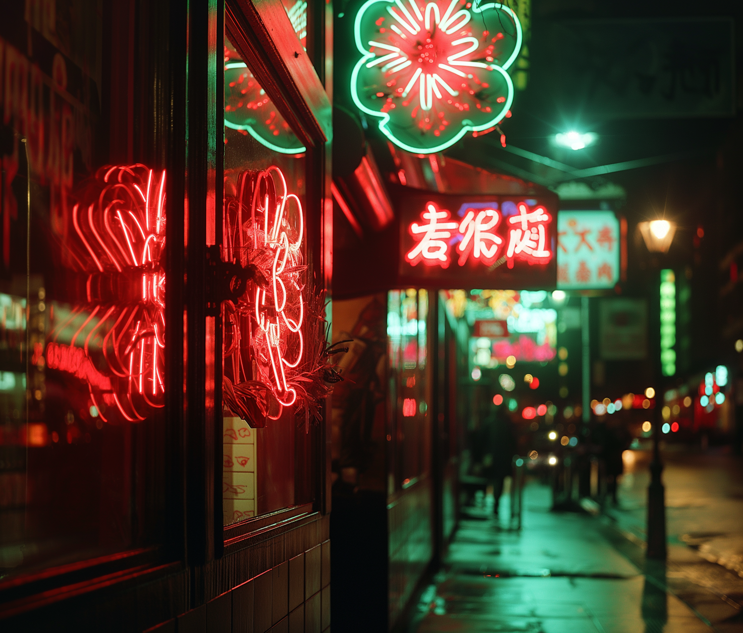 Vibrant night street scene with colorful neon signs reflecting on wet pavement, creating a lively urban atmosphere.