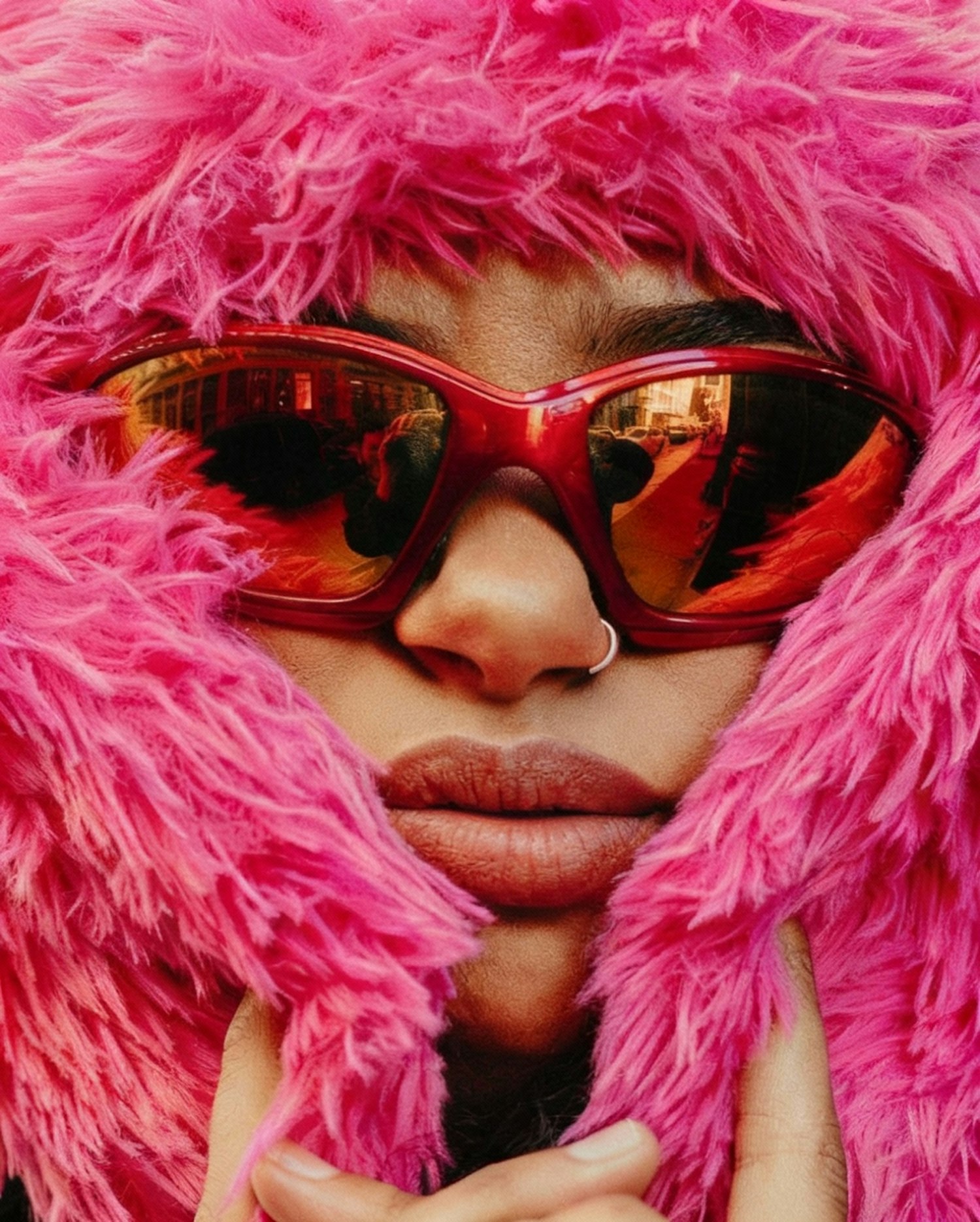 Close-up of a person in a pink faux fur hat and red sunglasses reflecting a city street, showcasing bold fashion and urban vibes.