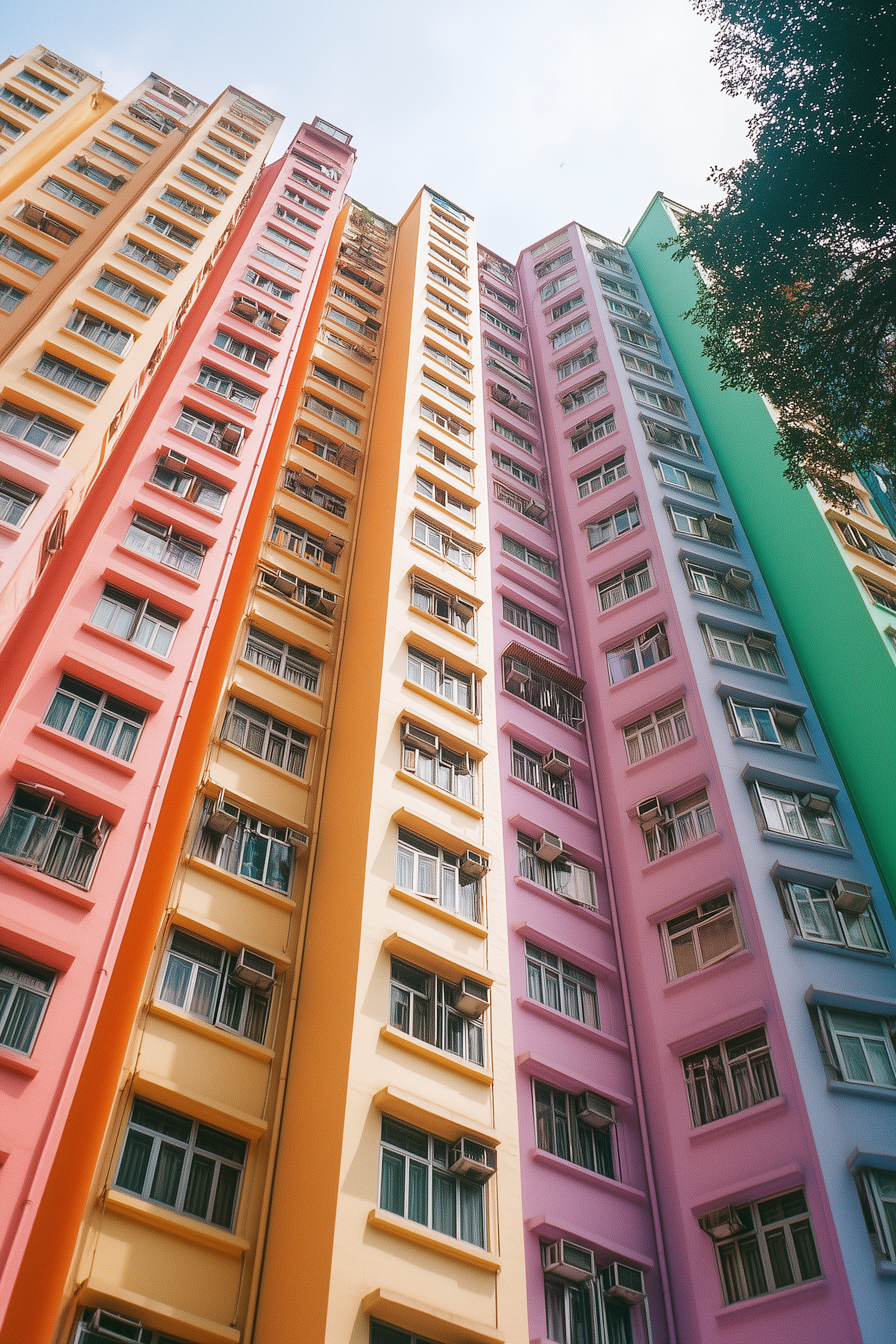 Vibrant pastel-colored high-rise buildings with windows and AC units, set against a clear sky and framed by a tree.