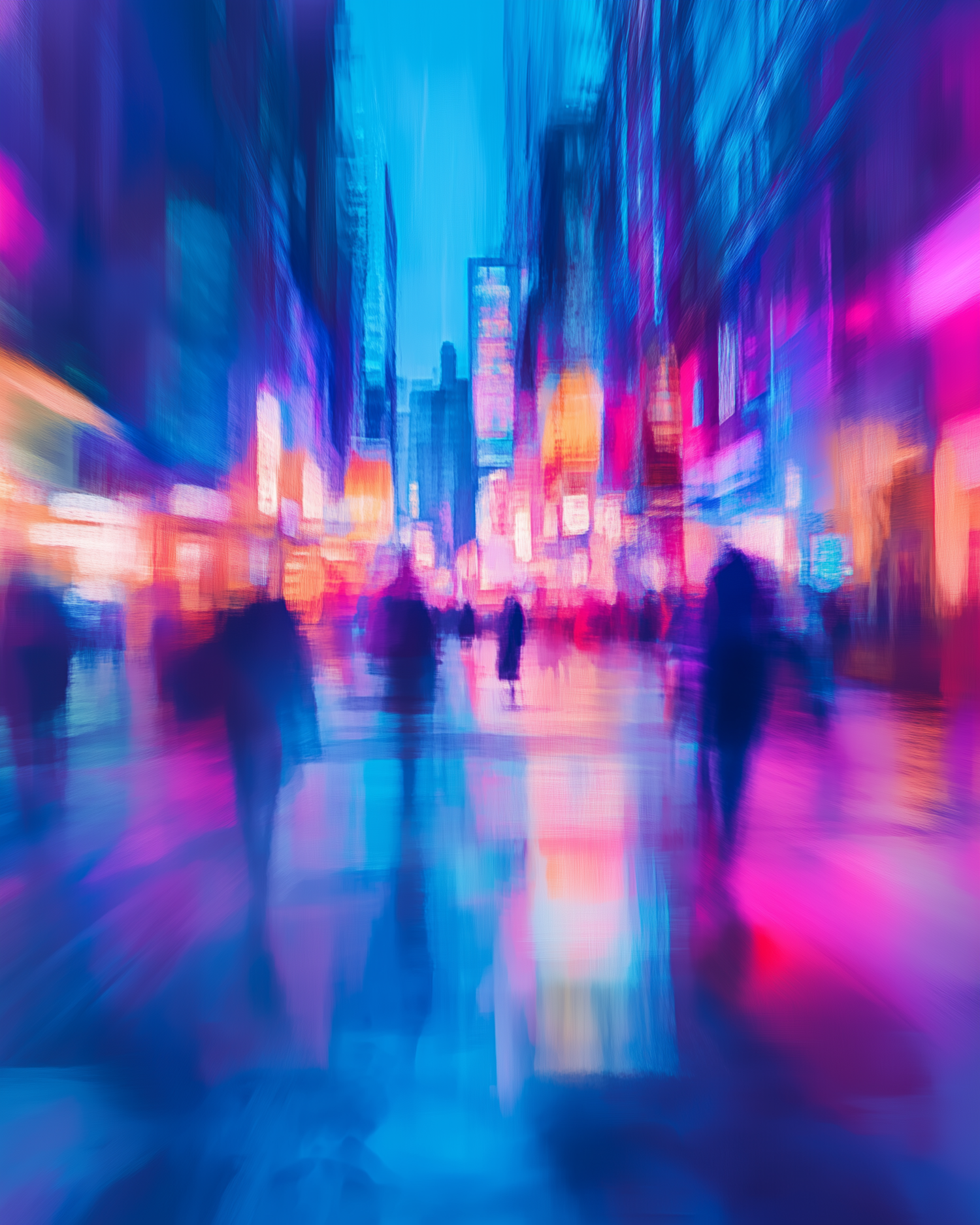Abstract cityscape with blurred figures and vibrant neon lights in blue, pink, and purple hues, creating a dynamic urban atmosphere.