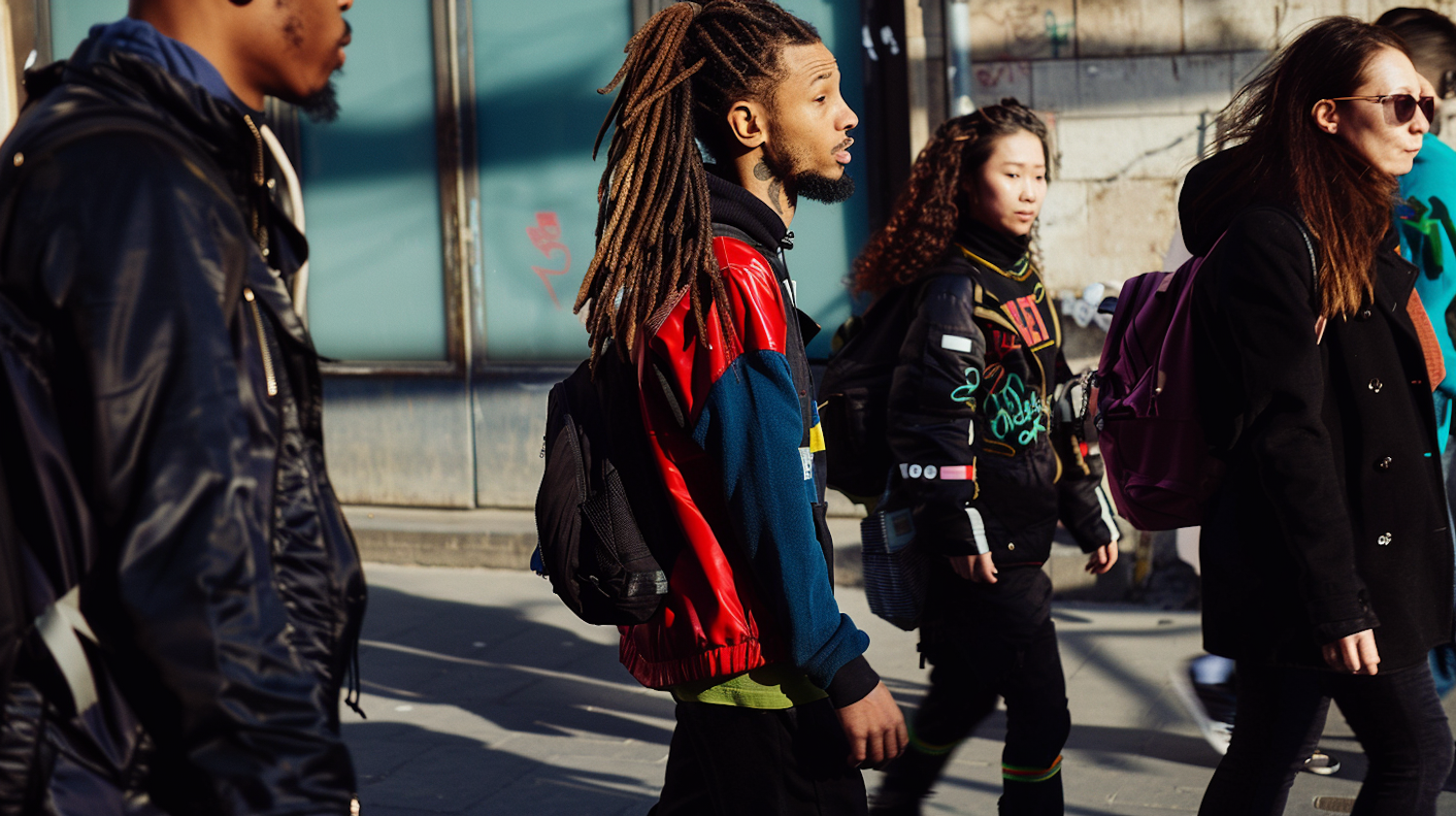 Diverse group walking in urban setting, showcasing unique street styles and vibrant fashion.
