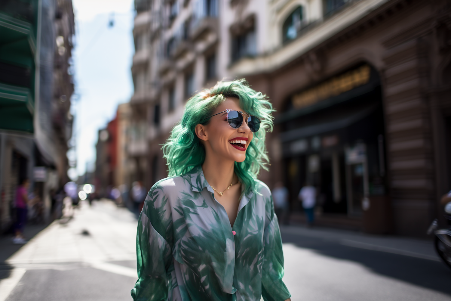Joyful woman with green hair and sunglasses in a vibrant city street, wearing a stylish green-patterned shirt.