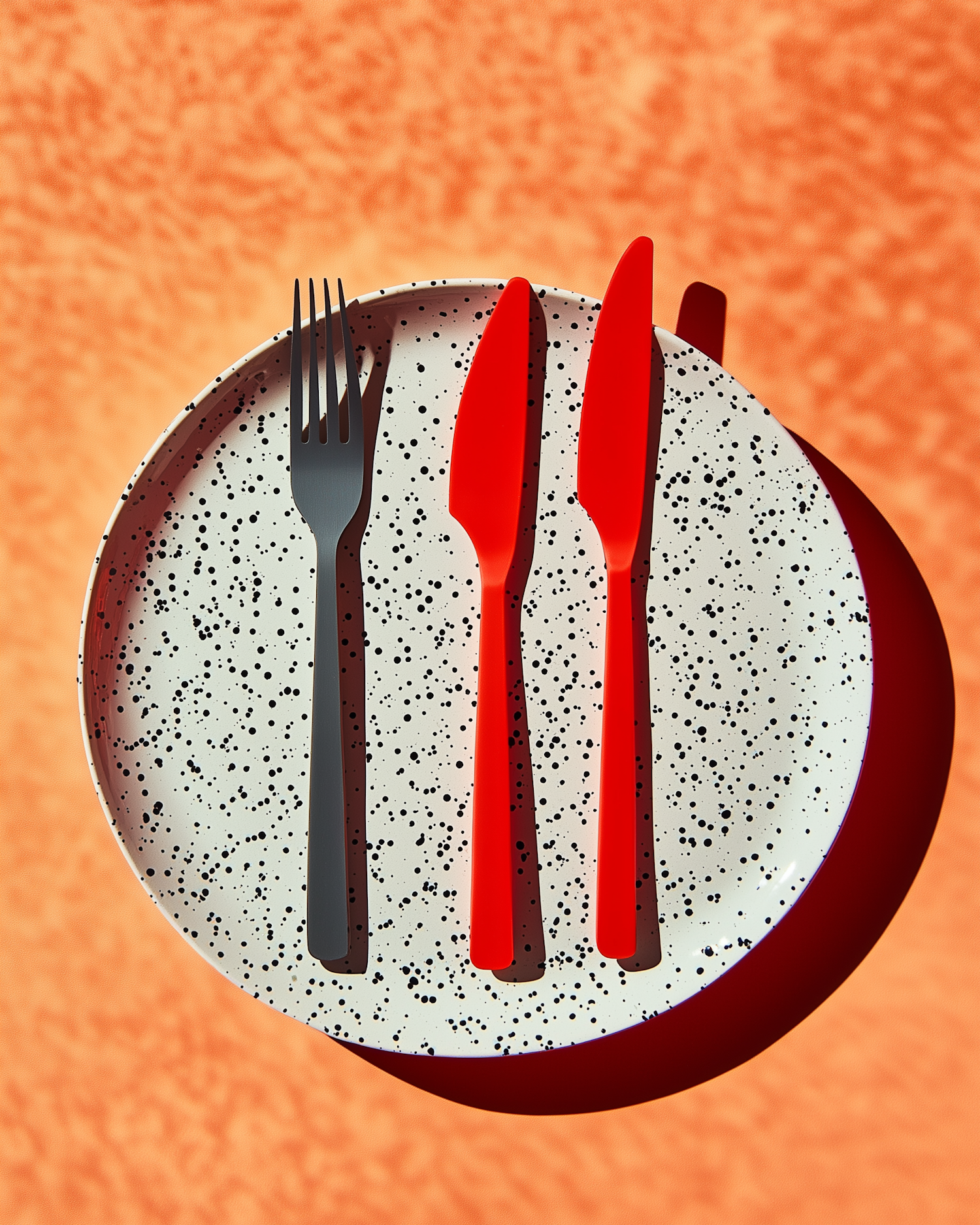 Speckled plate with black fork and red knives on vibrant orange background, creating a striking contrast and modern aesthetic.