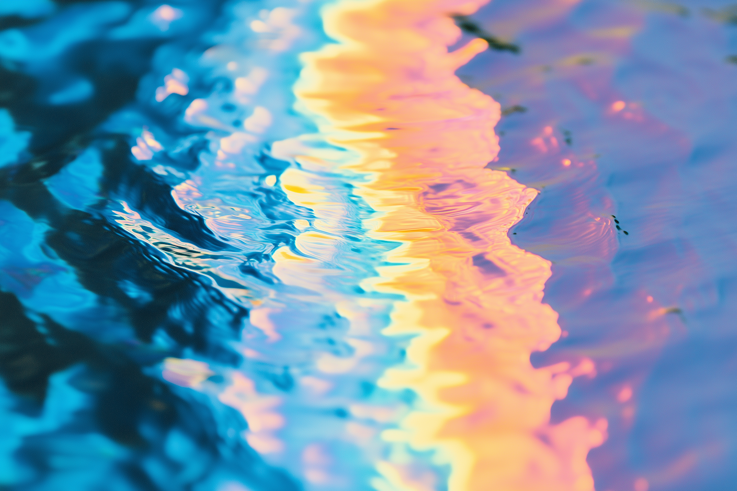 Vibrant water ripples reflecting sunset-like hues of blue, yellow, pink, and purple, creating a dreamy and abstract visual effect.