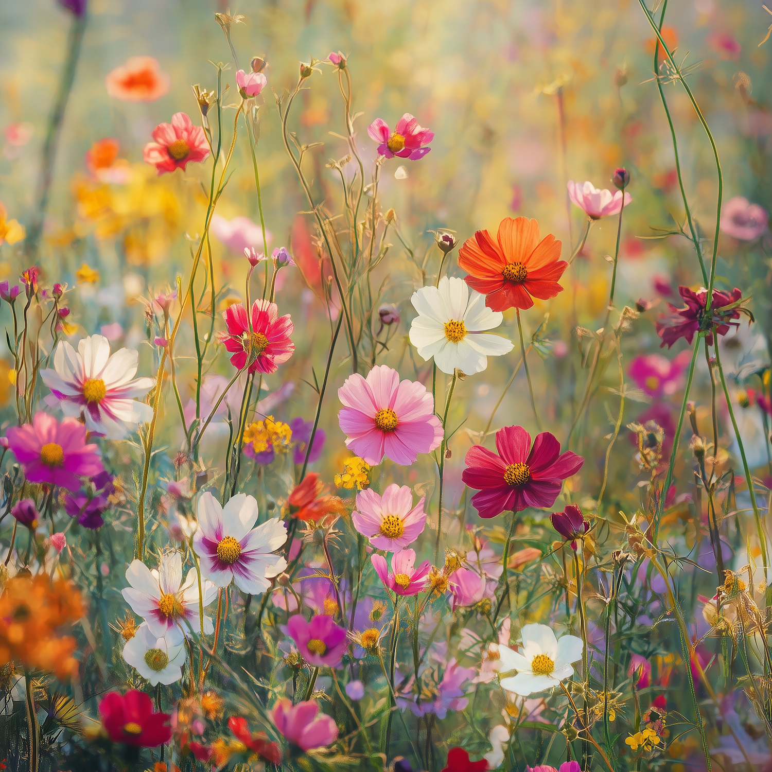 A colorful field of wildflowers in bloom, featuring pink, red, white, and orange blossoms under warm sunlight.