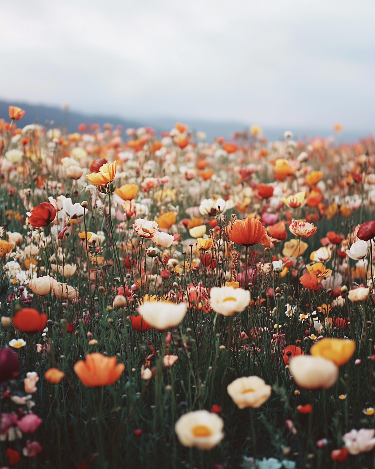 A vibrant field of colorful wildflowers in shades of orange, yellow, red, and white under an overcast sky.