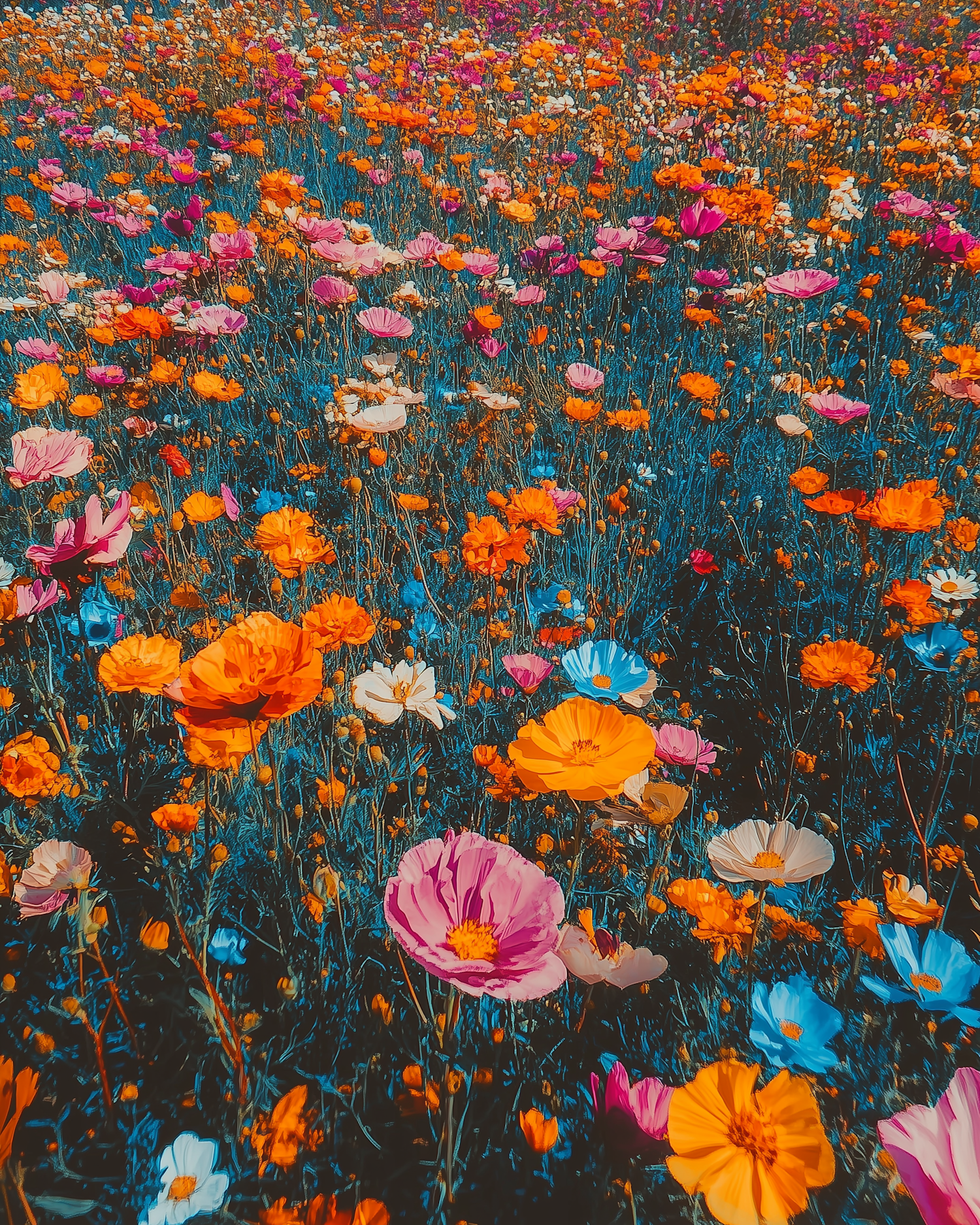 A vibrant field of colorful wildflowers in full bloom, featuring orange, pink, blue, and white blossoms under a sunny sky.