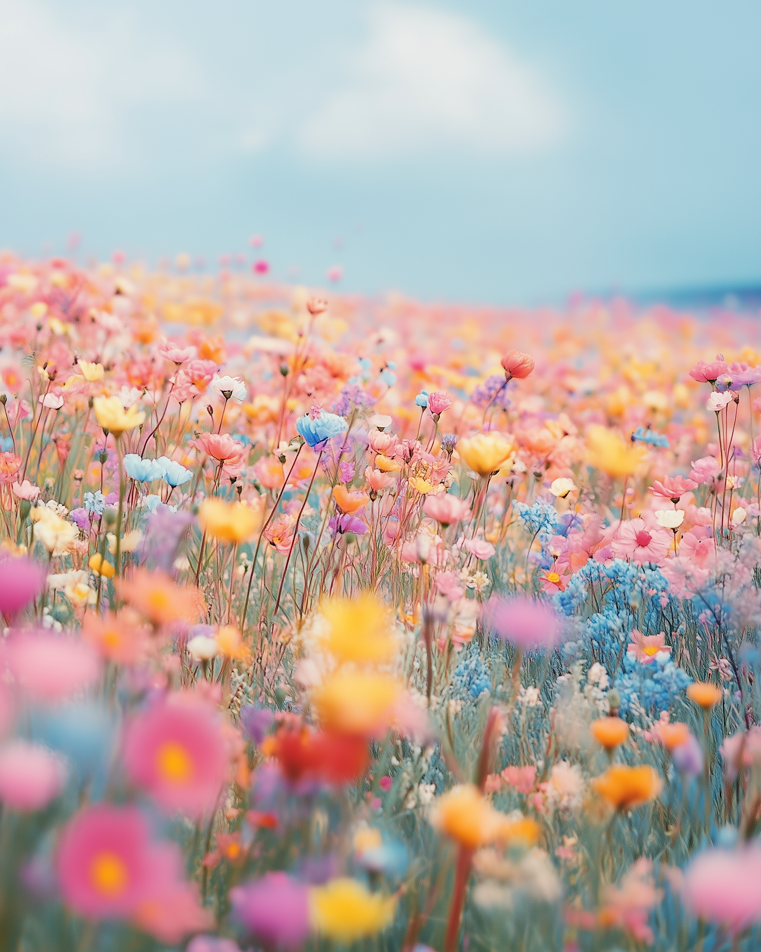 A dreamy field of colorful wildflowers under a serene blue sky, creating a vibrant and tranquil scene.