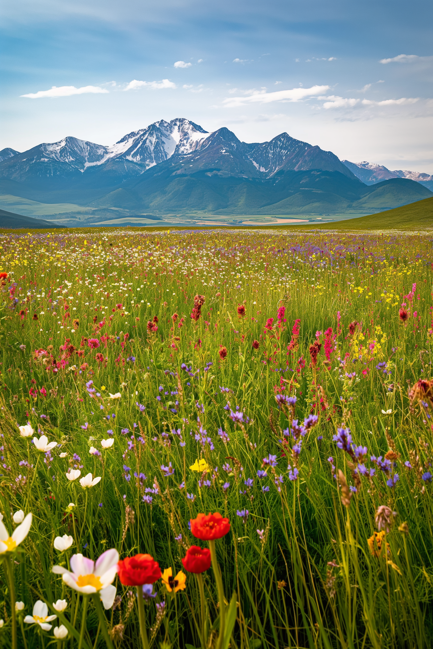 Colorful wildflower meadow with snow-capped mountains in the background under a clear blue sky.