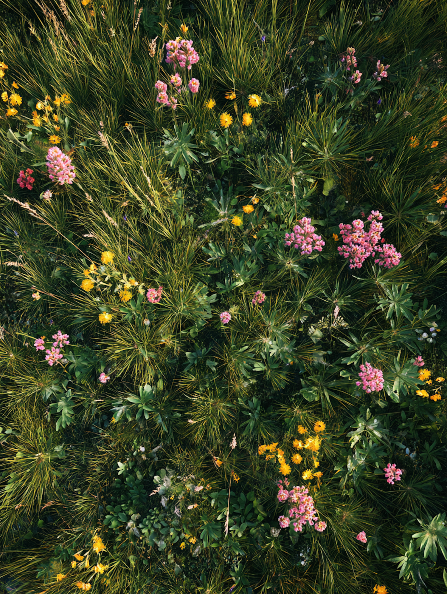 A lush meadow with vibrant pink and yellow wildflowers scattered among dense green grass, creating a serene and colorful natural scene.