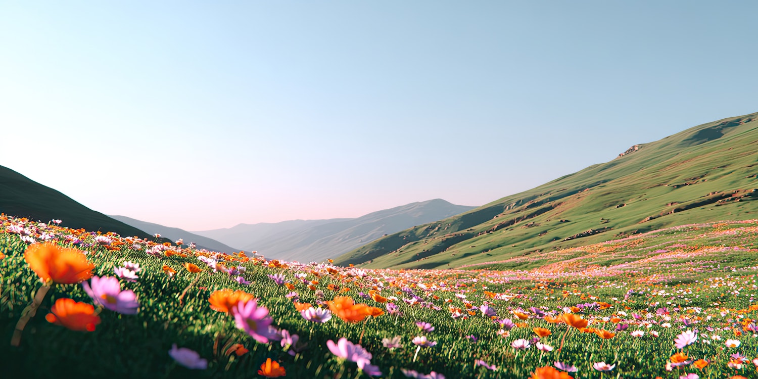 A colorful meadow of wildflowers on rolling green hills under a clear blue sky, creating a serene and picturesque landscape.