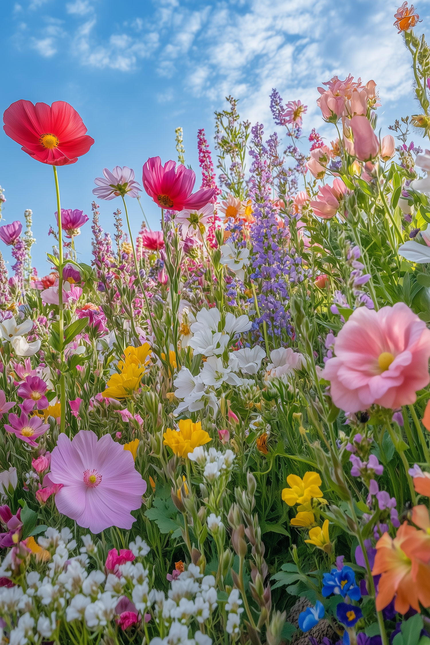 A vibrant field of wildflowers with red, pink, yellow, and purple blooms under a clear blue sky.