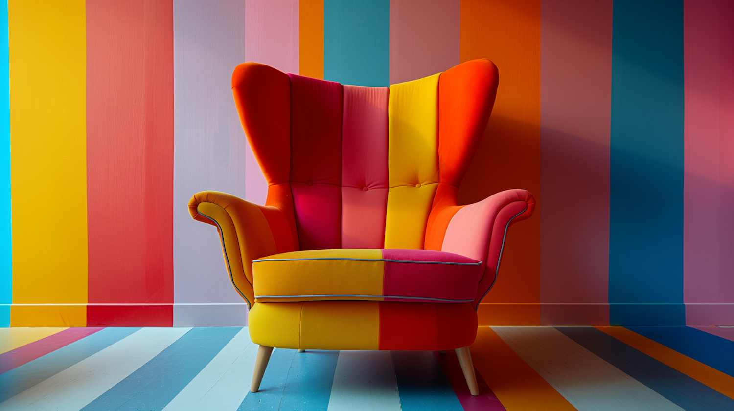 Vibrant multicolored armchair with bold stripes against a matching striped wall and floor, creating a playful and modern aesthetic.