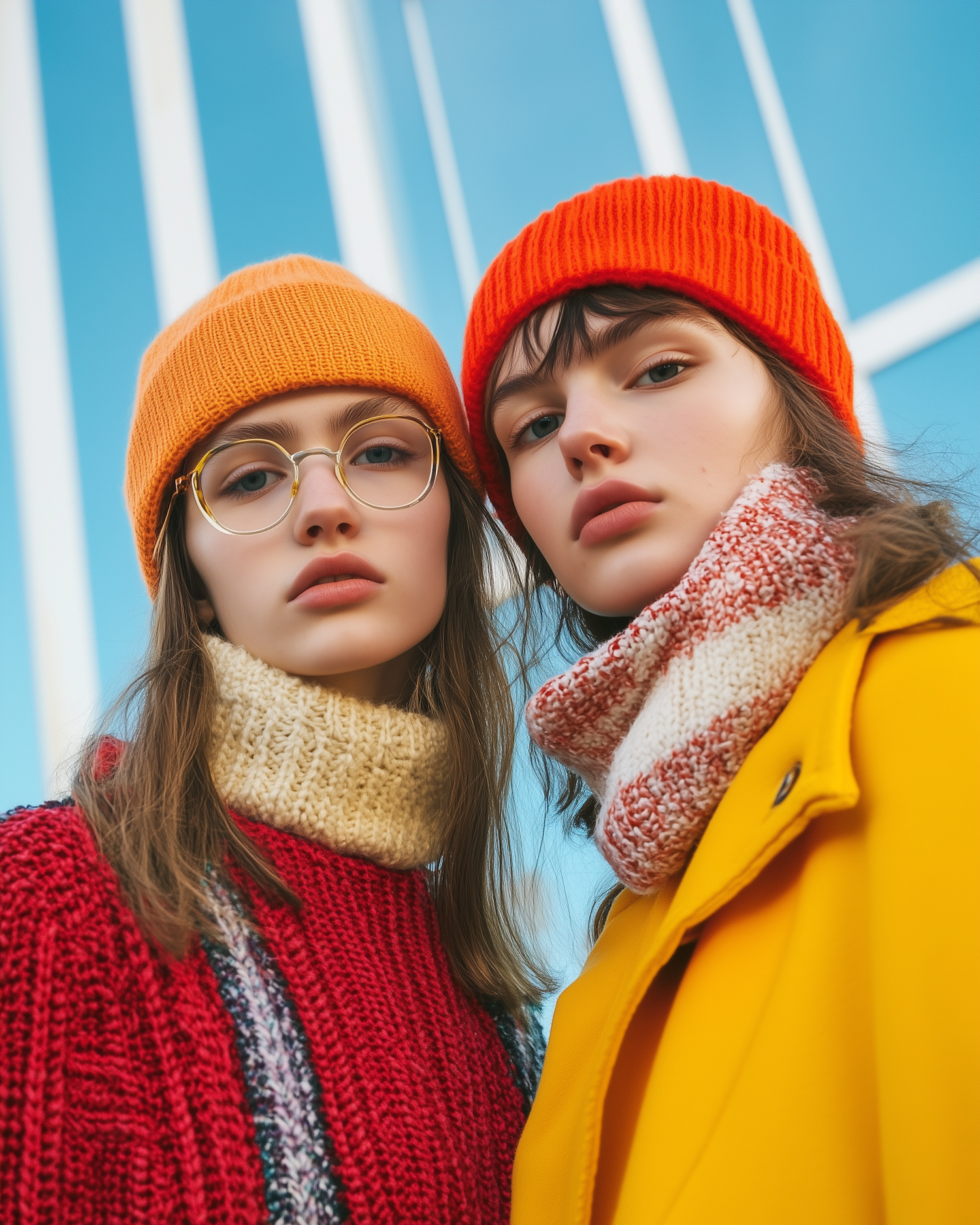 Two women in colorful knit hats and winter clothing pose against a bright blue sky, showcasing vibrant fashion and style.