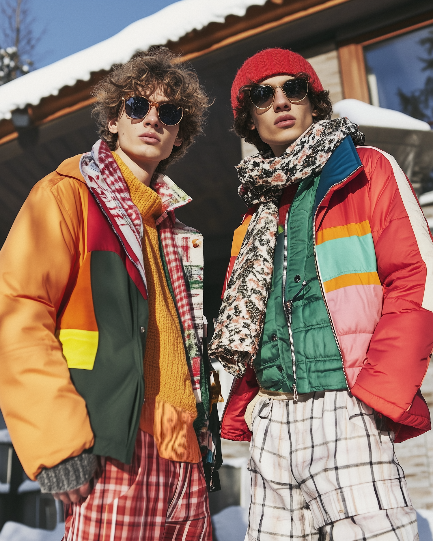 Two stylish young men in colorful winter outfits pose confidently in a snowy setting, showcasing vibrant fashion and modern style.