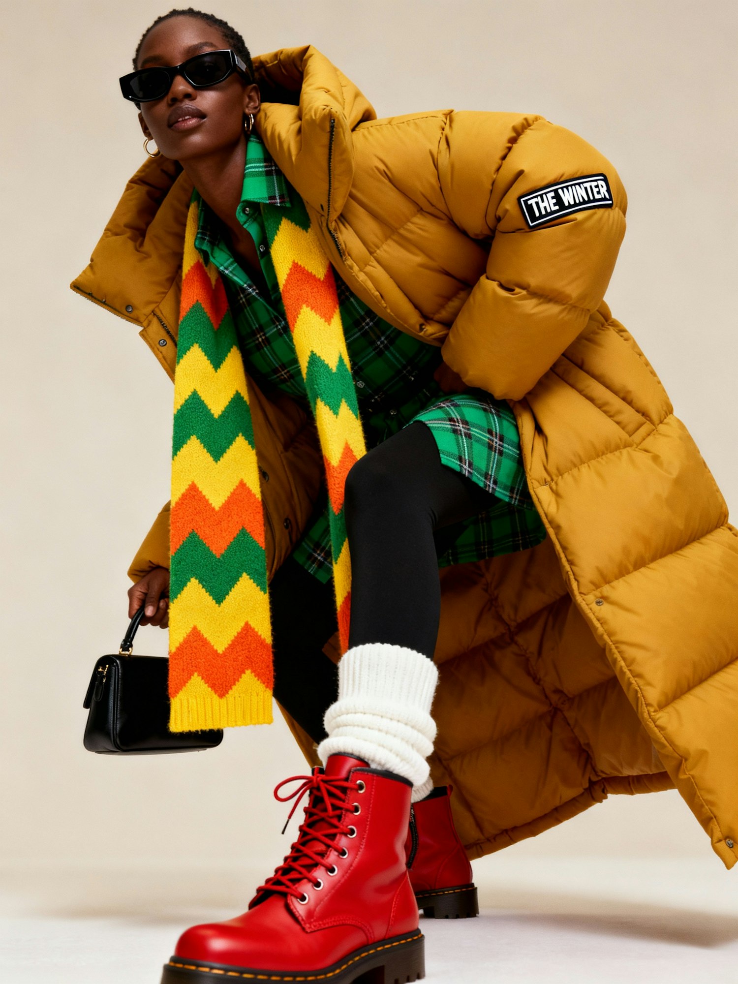 A close-up editorial portrait of a stylish Black woman wearing a long, oversized mustard-yellow puffer coat with a high collar and visible “THE WINTER” patch on the sleeve. Underneath, a green plaid shirt peeks through, paired with a multicolored zigzag scarf in shades of yellow, orange, and green. She accessorizes with black sunglasses, a small black handbag, white leg warmers, black leggings, and red lace-up boots. Her glowing, hyperrealistic skin contrasts beautifully with the rich textures and bold colors. The plain backdrop and soft, diffused lighting enhance the winter-forward, designer-driven aesthetic with a confident, editorial edge.