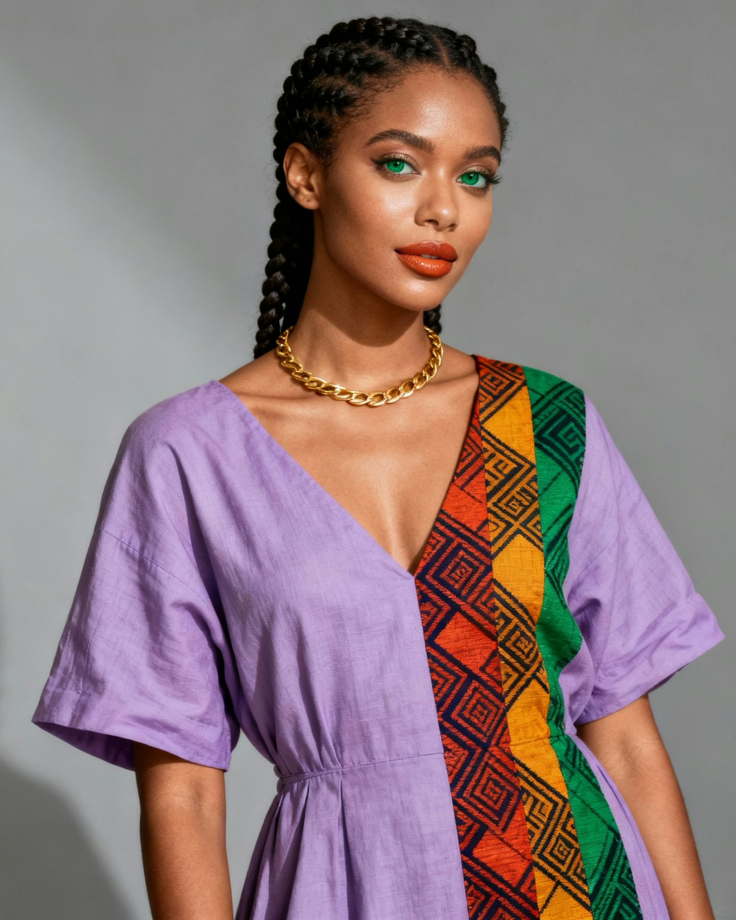 Full-body, high-definition portrait of a woman with glowing skin, green eyes, box braids, and warm-toned makeup, wearing a gold necklace with a loose-fitting lavender dress with a bold geometric panel i 3 complimentary colors along one side. The dress features a V-neck and short sleeves, blending traditional textile motifs with modern silhouette design. She stands confidently with a composed expression. The neutral gray background enhances the tones of her outfit, making the layered textures stand out. Lighting is soft and directional, casting subtle highlights across her skin and garment. The overall mood is modern, modest, and editorially sharp—ideal for a Gen Z fashion portrait or Afro-fusion identity showcase.