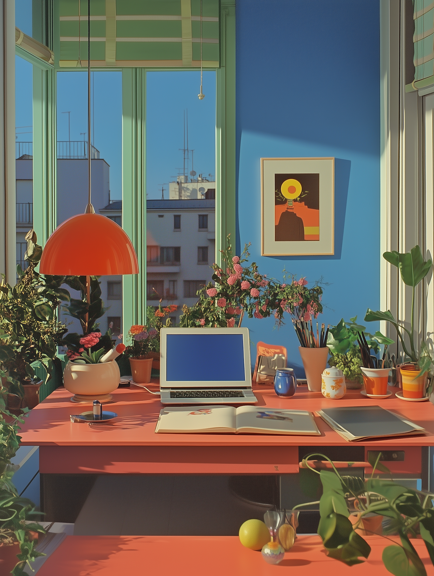 Bright workspace with orange desk, laptop, plants, and city view. Blue walls and red lamp add vibrant contrast.