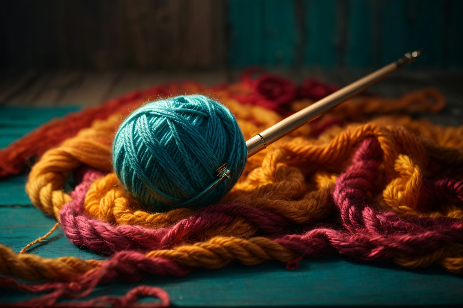 Colorful yarn and knitting needle on a rustic teal wooden surface, featuring vibrant turquoise, orange, pink, and red hues.
