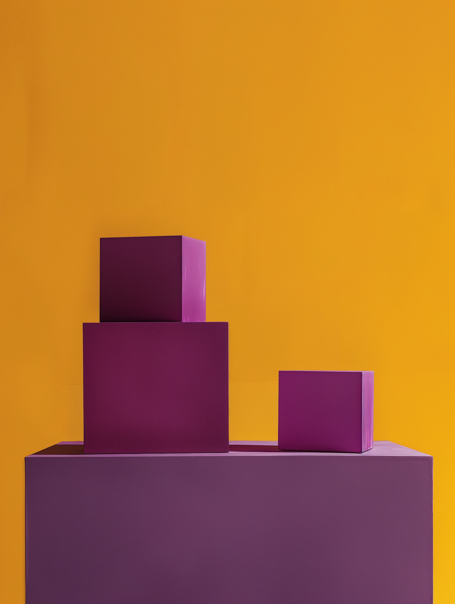 Minimalistic arrangement of purple cubes against a vibrant orange background, showcasing geometric shapes and bold color contrast.