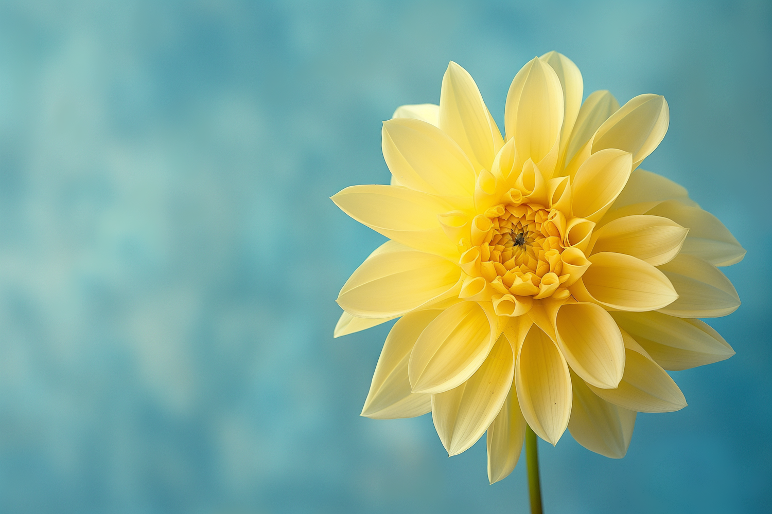 Bright yellow dahlia flower against a soft blue background, showcasing intricate petal details and vibrant colors.
