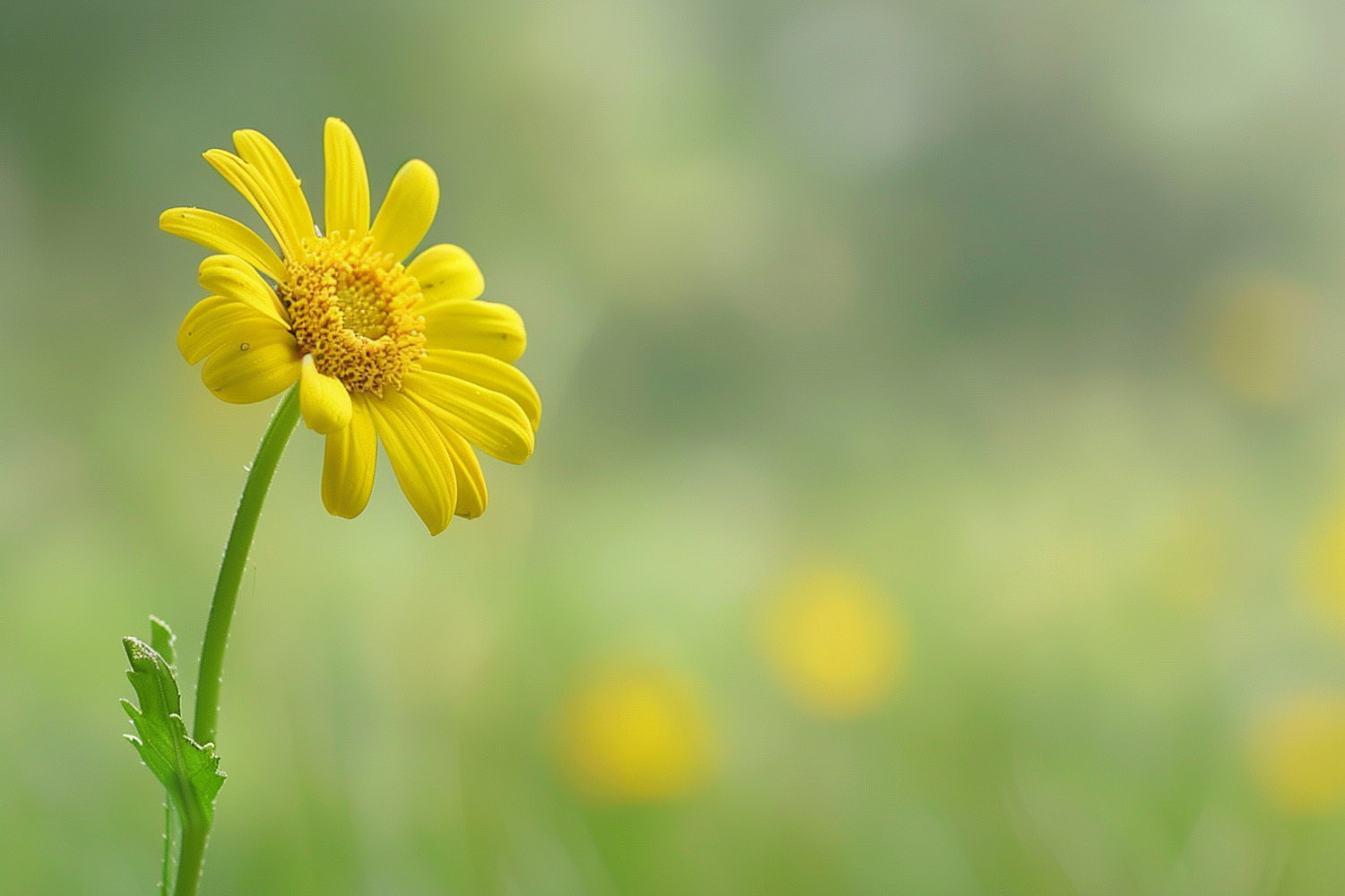 Vibrant yellow daisy against a soft green background, highlighting its delicate petals and textured center in a serene, natural setting.