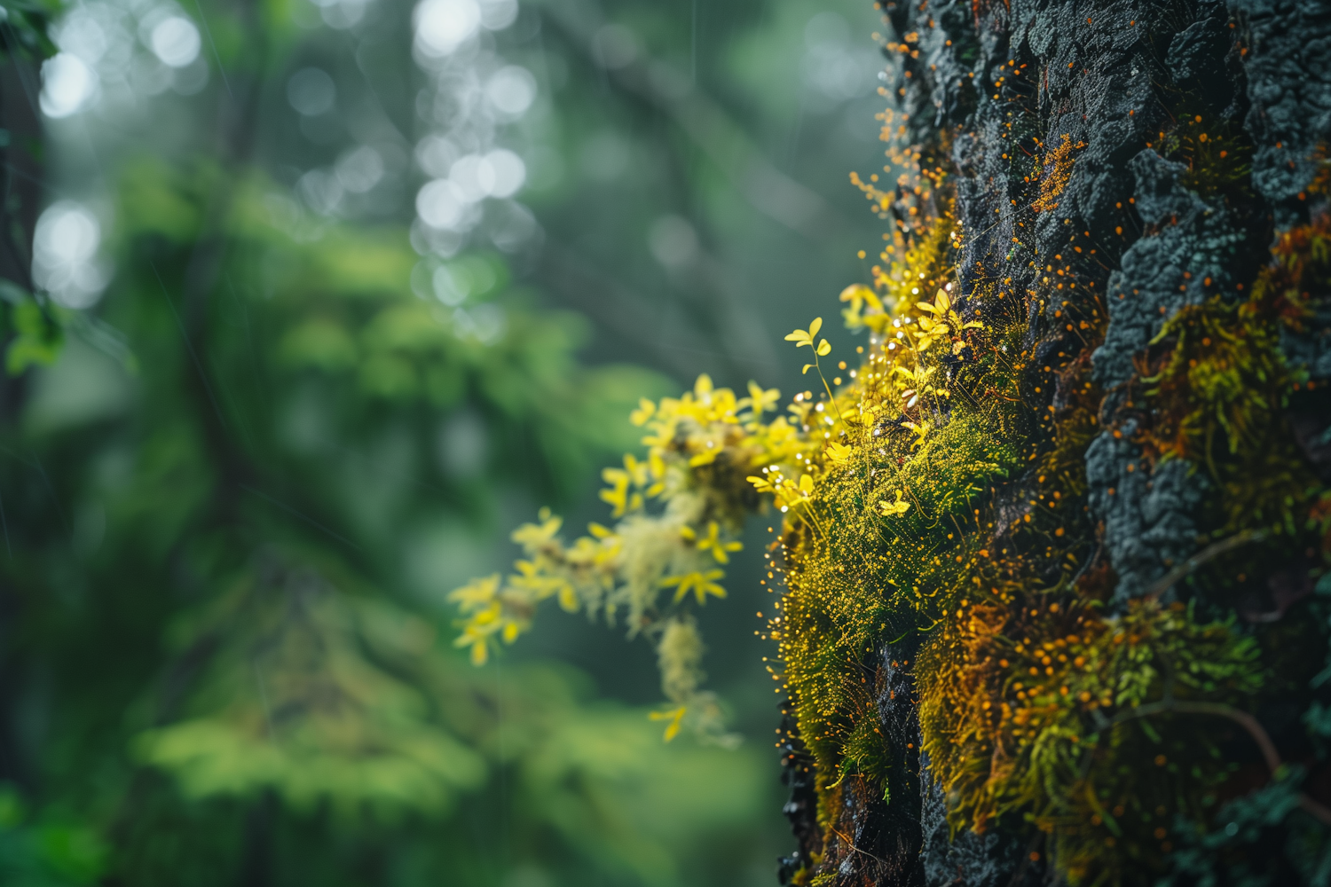 Close-up of a tree trunk with vibrant yellow and green moss in a lush forest setting, highlighting nature's intricate details.