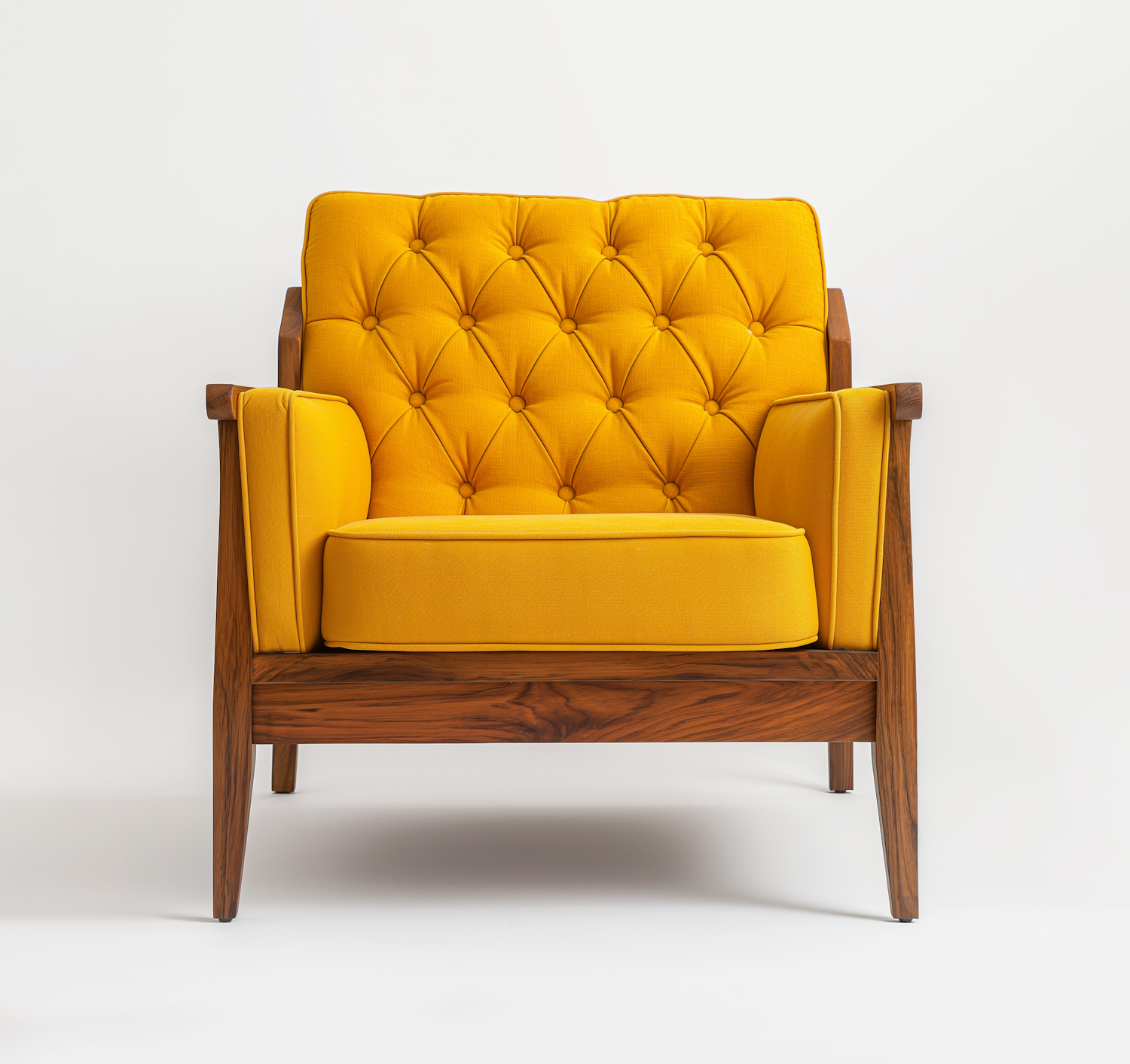 Mid-century modern yellow armchair with tufted backrest and wooden frame, perfect for adding a pop of color to any room.