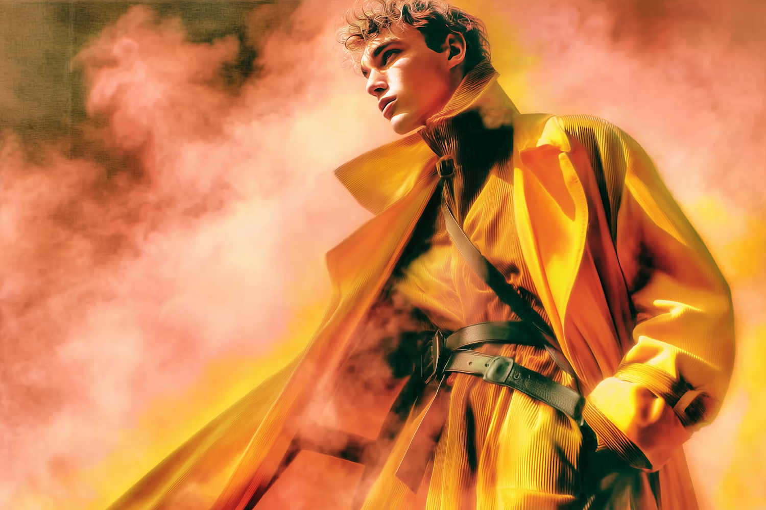 A person in a yellow trench coat stands against a dramatic background of swirling orange and yellow smoke, creating a vibrant and dynamic scene.