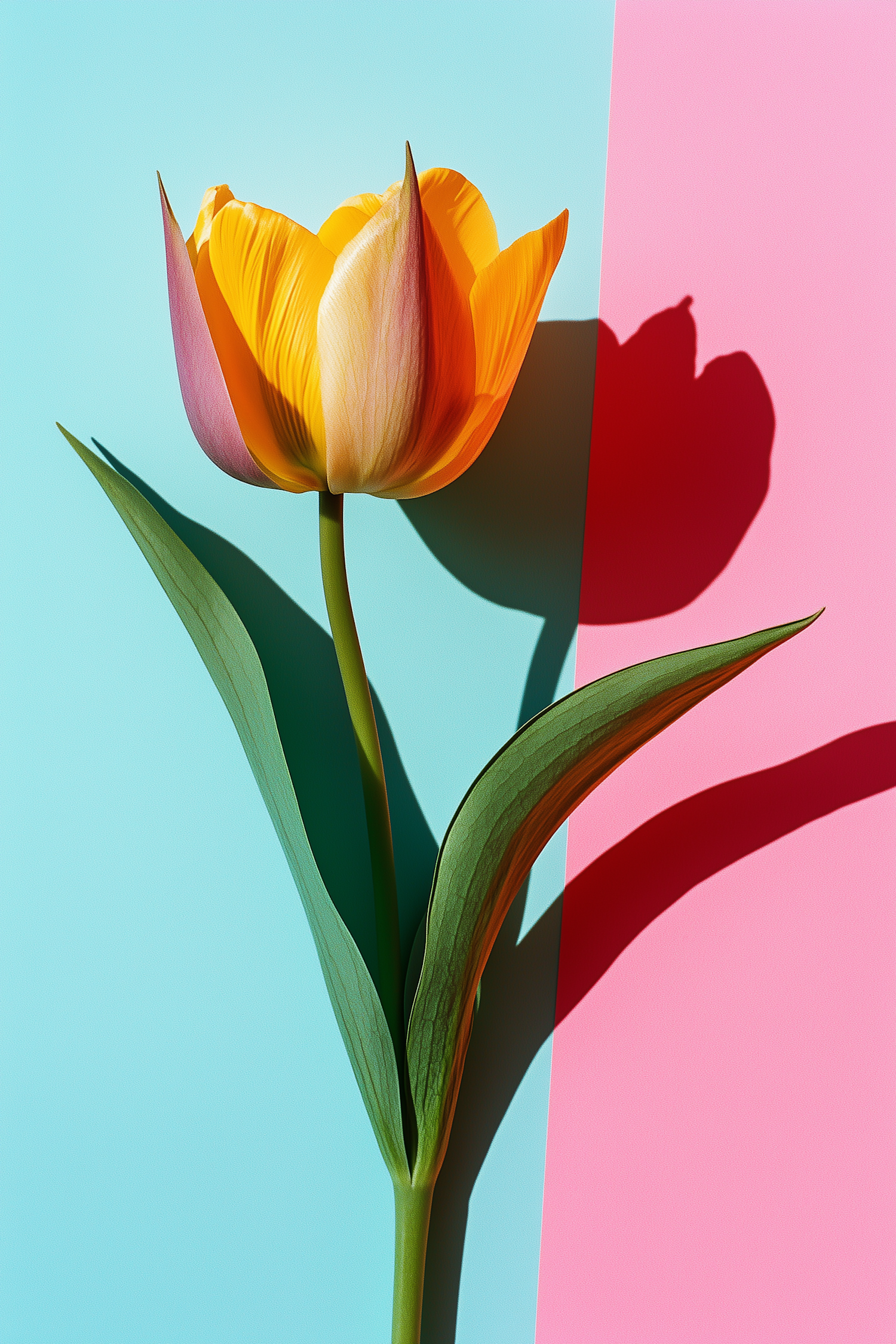 A bright yellow tulip with pink accents stands against a pastel blue and pink background, casting a bold shadow. Minimalist and vibrant.