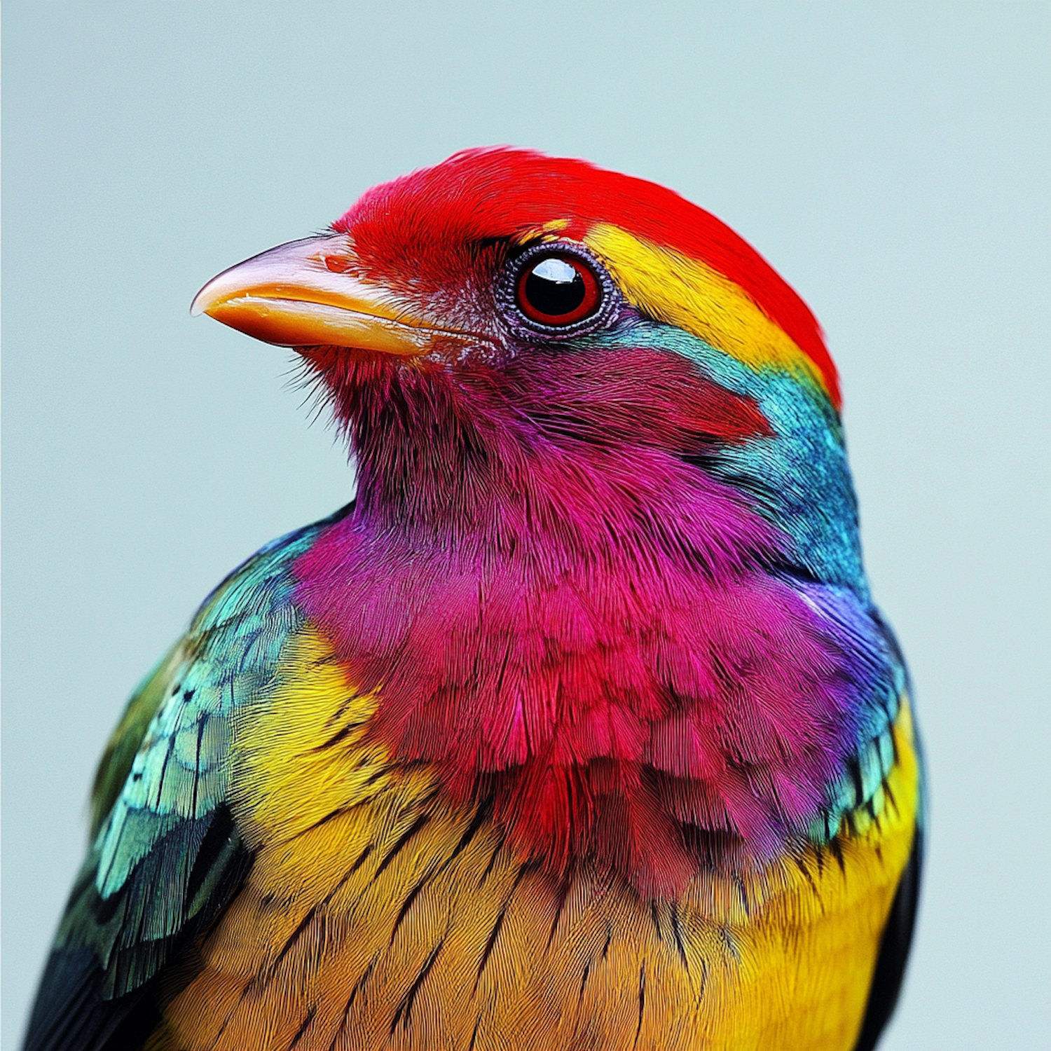Vibrant bird with red, yellow, magenta, and blue feathers against a soft gray background, showcasing a stunning array of colors.