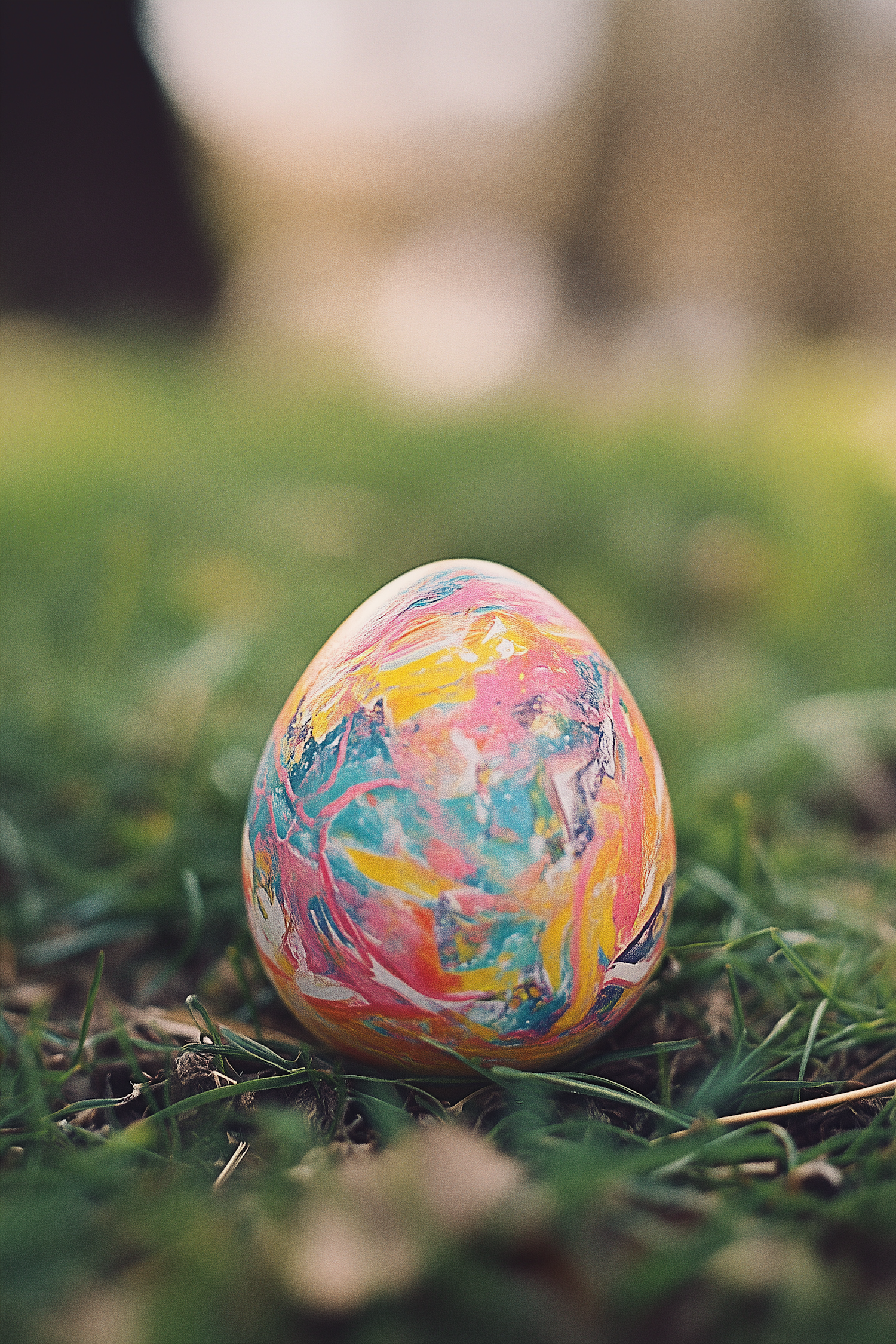 Colorful marbled egg on green grass, featuring vibrant pink, yellow, and blue swirls. Soft focus background enhances the egg's design.