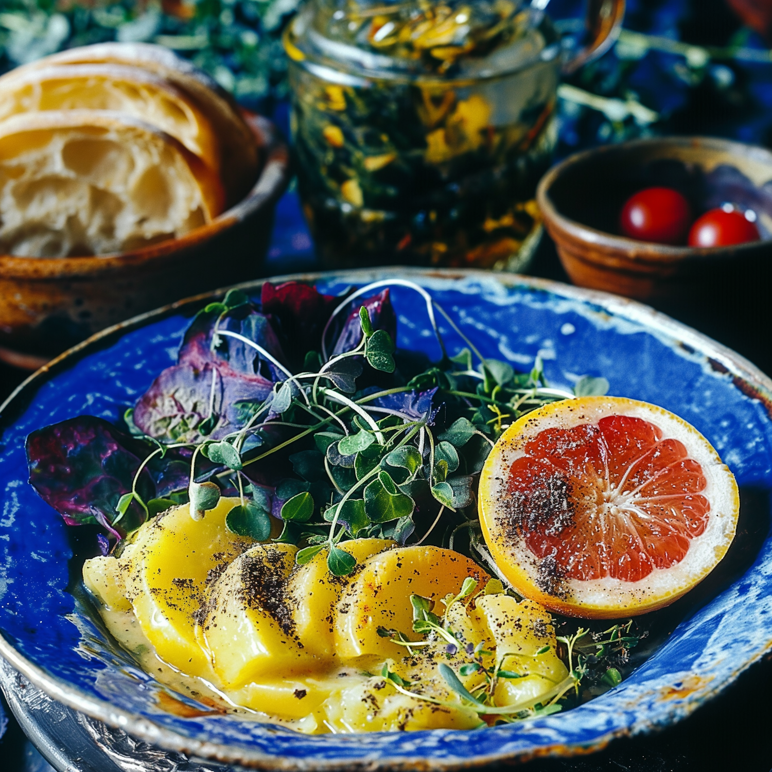 Colorful dish with sliced potatoes, microgreens, and grapefruit in a rustic blue bowl, surrounded by bread and herbal infusion.