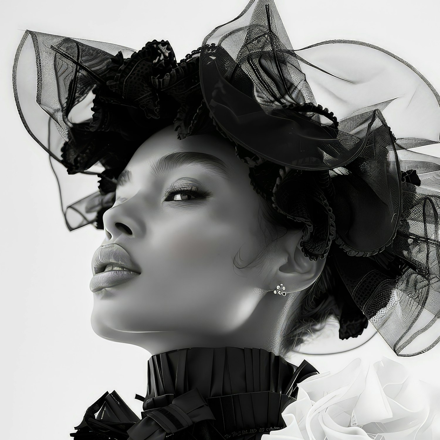 Elegant black and white portrait of a woman in a dramatic hat and ruffled outfit, showcasing intricate lace details and bold contrasts.