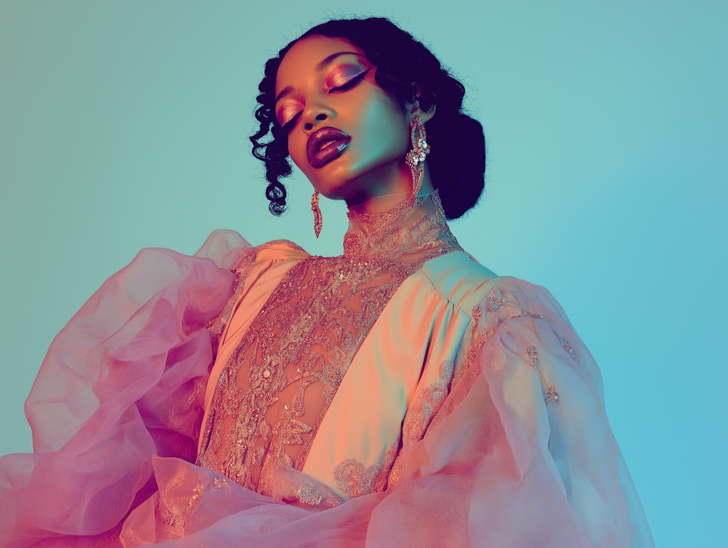 Elegant woman in ornate gown with shimmering makeup and voluminous sleeves, set against a teal and pink gradient background.