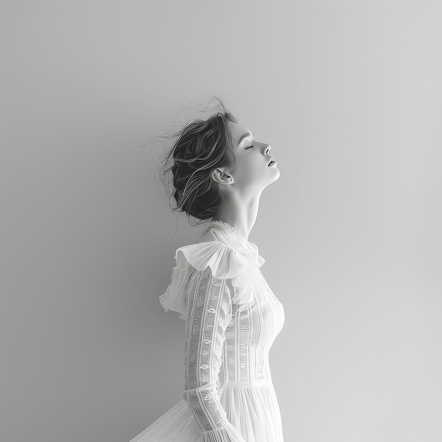 Elegant woman in a white lace dress with an updo, eyes closed, against a soft gray background. Monochromatic and serene.